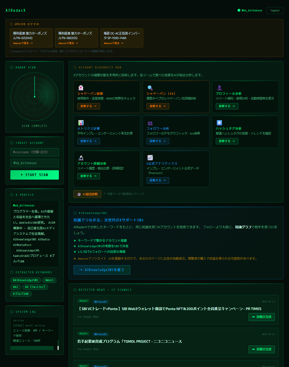 Multi-angle X account diagnosis. Shadowban detection, AI keyword extraction, real-time news collection, and automatic post draft generation — all in one.